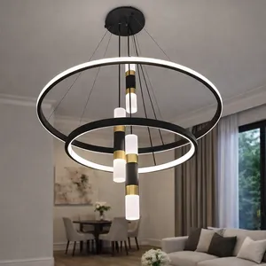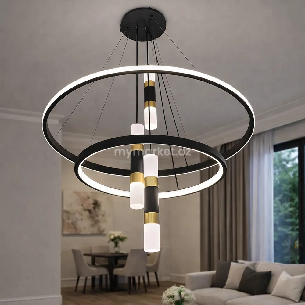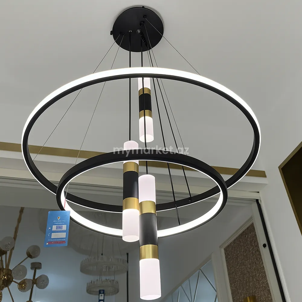 Bu model müasir interyerlər üçün nəzərdə tutulmuş dekorativ LED çilçıraqdır. İki halqa formalı konstruksiyası və mərkəzdə yerləşən silindrik işıq elementləri dizayna dinamika və zəriflik qatır. Qara metal korpus və qızılı dekor elementlərinin birləşməsi çilçırağa premium görünüş verir.