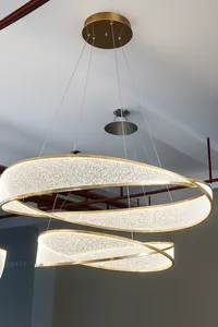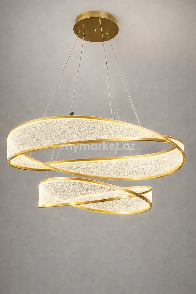 Bu model müasir dizaynlı, qızılı metal korpuslu və LED texnologiyalı dekorativ çilçıraqdır. İki spiral formalı halqadan ibarət konstruksiyası interyerə həm zəriflik, həm də müasir estetika qatır. Halqaların daxilində yerləşən kristal teksturalı diffuzor işığı bərabər və yumşaq şəkildə yayaraq otaqda komfortlu atmosfer yaradır.